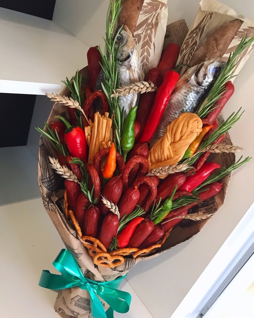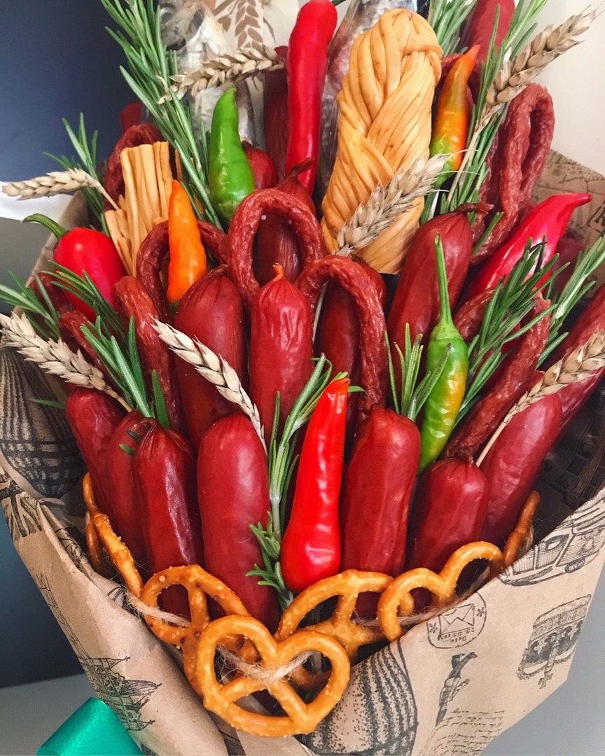 Состав: 2 батона, сушеная рыба, колбаски (2 вида), сыр косичка, перец острый, розмарин (другая зелень), колоски.