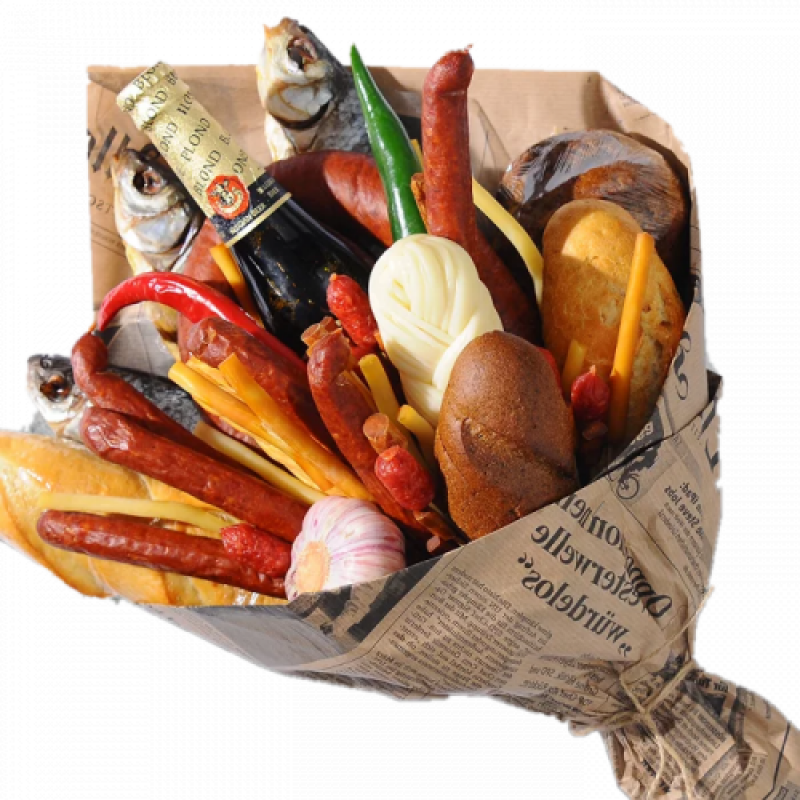 Состав: Колбаса, батон, сыр чечил (или косичка), рыба сушеная, колбаски, сырные палочки, напиток, перец острый.