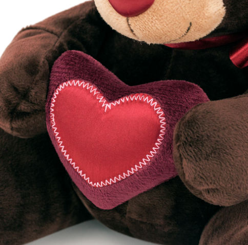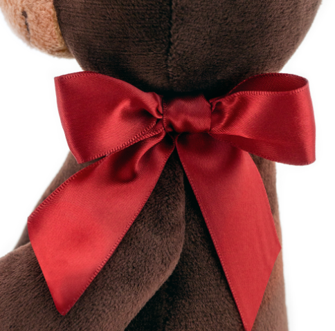 Сидящий Чоко с красивым темно-бордовым атласным бантом держит большое плюшевое сердце с атласной вставкой в тон. Этот мягкий игрушечный мишка дарит свое сердце и веселое настроение тем, кто ему дорог больше всего.