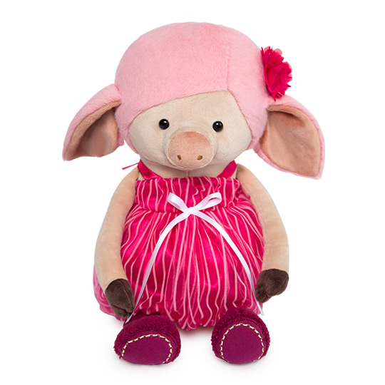 Свинка в меховых ботиночках рубиново-малинового цвета. Одета свинка в очаровательный сарафанчик с завязочкой на шее. Сарафанчик сшит из сатина сочного малинового цвета, с верхним слоем из полосатой сеточки. Спереди сарафан украшает бантик из белой атласной ленты. На голове у свинки украшение — малиновый цветок из шёлка.