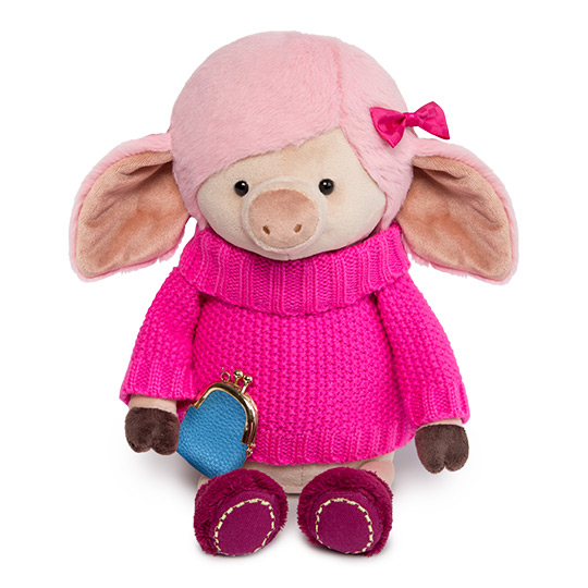 Необыкновенно уютный свитер цвета малиновой розы. В комплекте – маленькая сумочка цвета морозного неба с золотистой фурнитурой. На голове свинки атласный малиновый бантик.