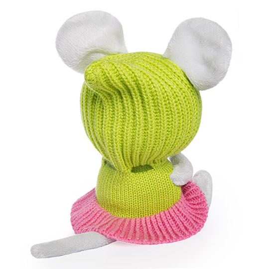 Мышка в ярком вязаном платье с капюшоном, оборкой и шнурком, завязанным на бантик.