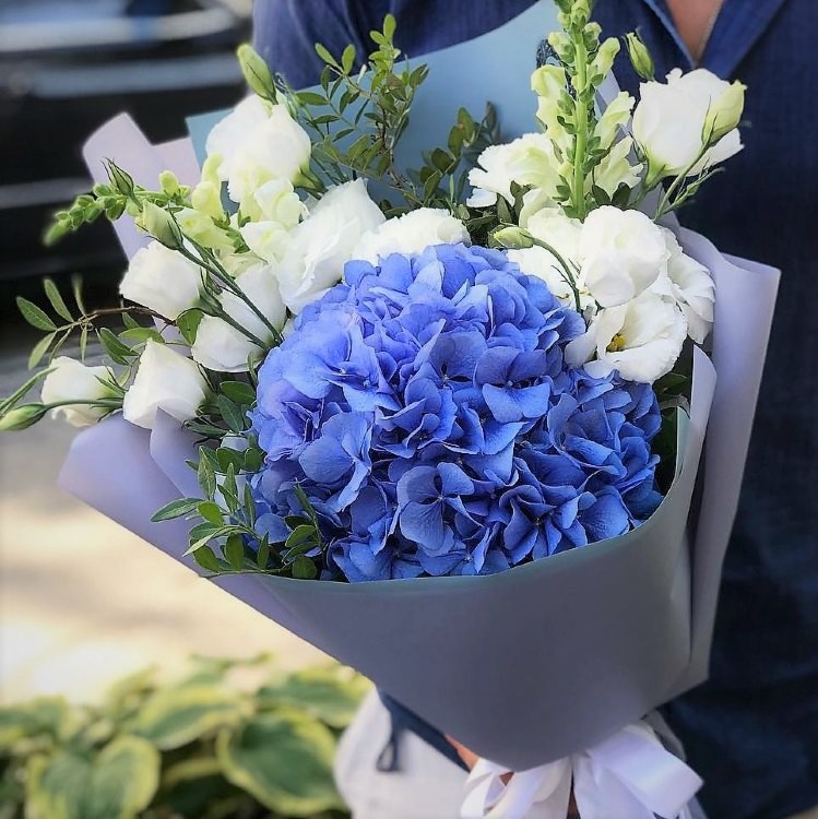 На первый взгяд простой, но с изюминкой букет из 1 гортензии (цвет может меняться), 3 эустом, 2 матиол (возможна замен на эустому), зелени писташ.