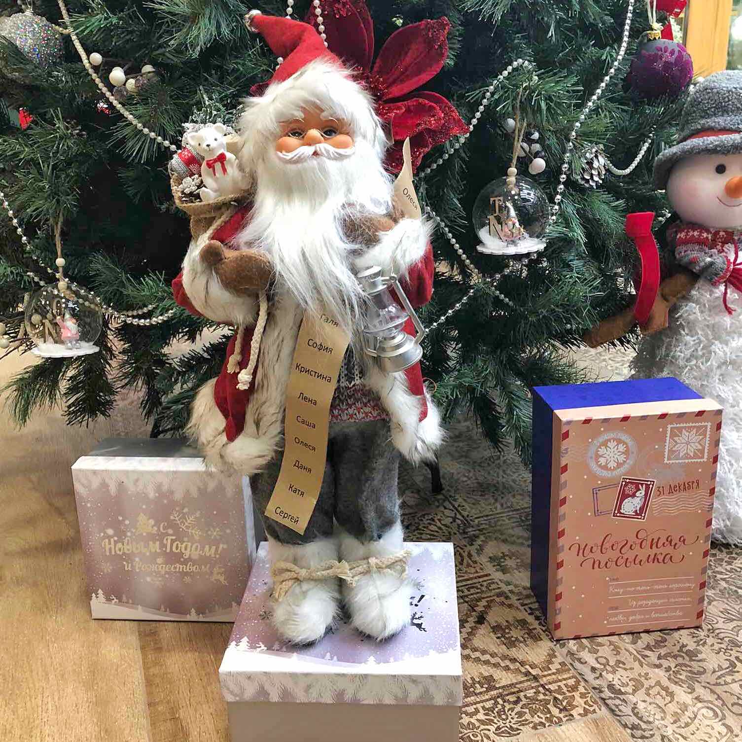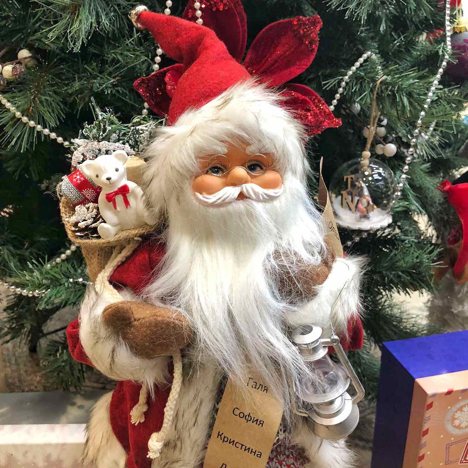 Новогодний сувенир Санта-Клаус с подарками и фонариком в красной шубке.