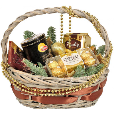 Состав корзинки: чай Lipton, упаковка кофе Paulig, плитка шоколада, коробка конфет Ferrero Rocher 125 гр, новогоднее урашение.