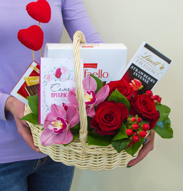 Состав корзины: шоколад Мерси 100 гр, конфеты Раффаэлло 240 гр, шоколад Линдт 100 гр, открытка (может меняться), декор, цветы (2 орхидеи, 3 розы и гиперикум).