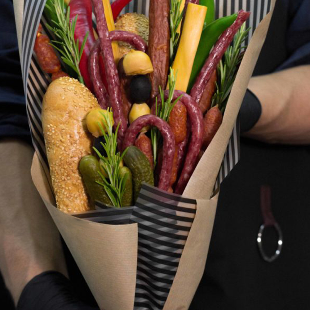 Состав: красный и зеленый перец Чили, сырные палочки, колбаски охотничьи, сырные шарики, соленые огурцы, батон, зелень.