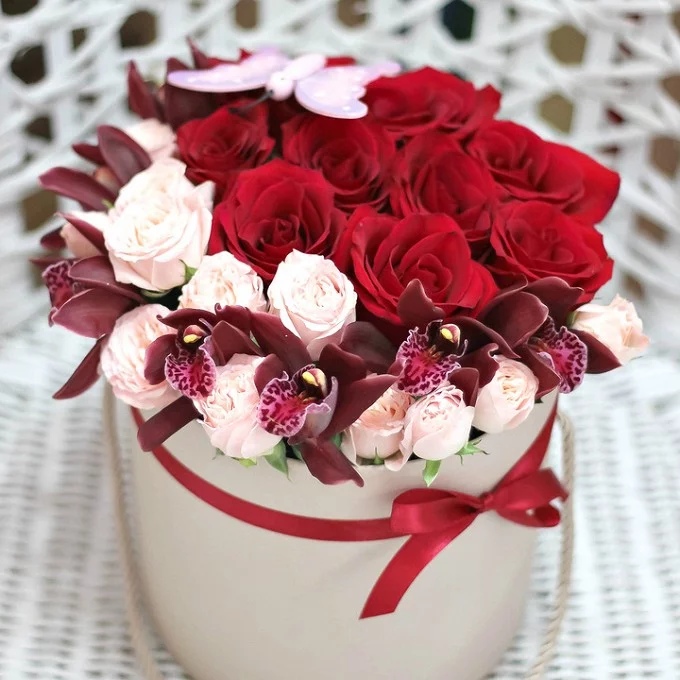 Состав: 9 красных роз, 7 орхидей, 3 веточки кустовой розы.