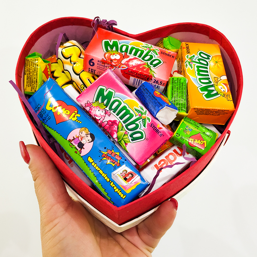 Состав коробки: 2 шт конфет Меллер, 3 Мамба, 8 палочек киндер и жевательные резинки (не обязательно lovе is…, могут быть зменены на другие)