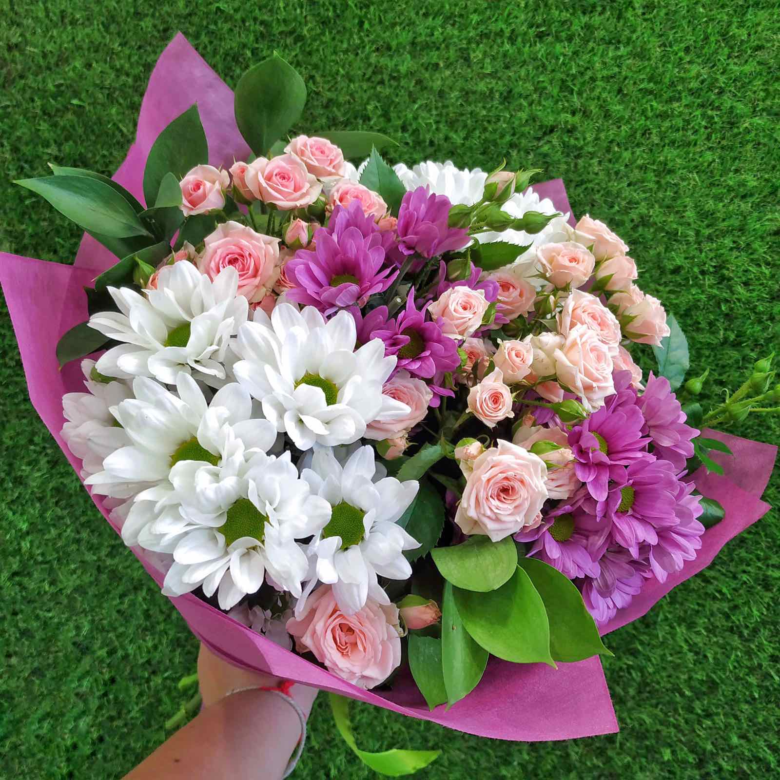 Состав: 4 веточки кустовые хризантемы, 3 кустовые розы.