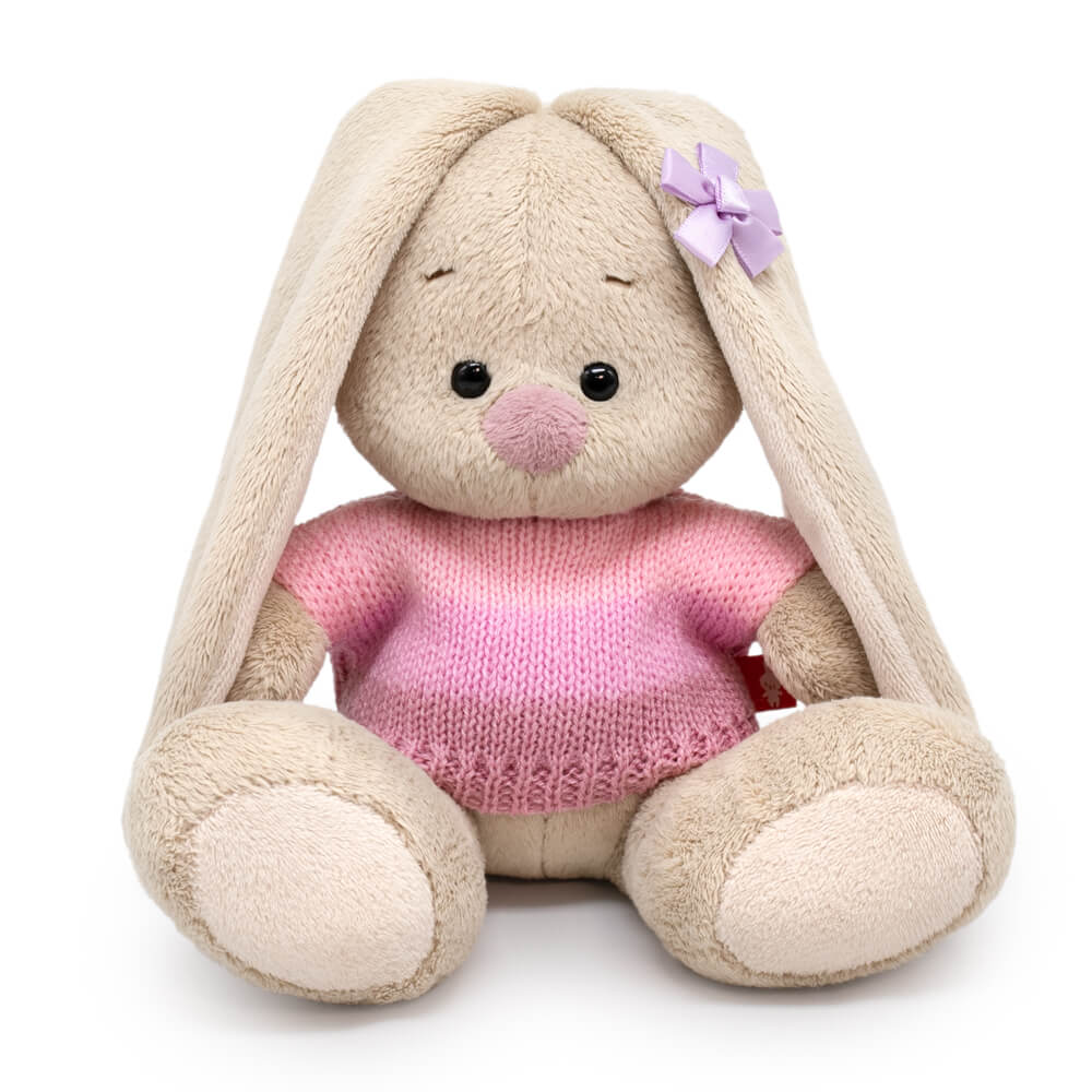 На малышке Зайке интересный и очень нежный вязаный свитер с полосами в разных оттенках дымчатой розы. На ушке цветочек из лавандовой атласной ленты.