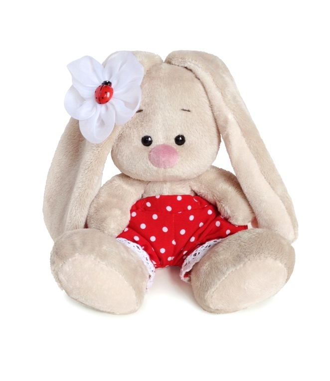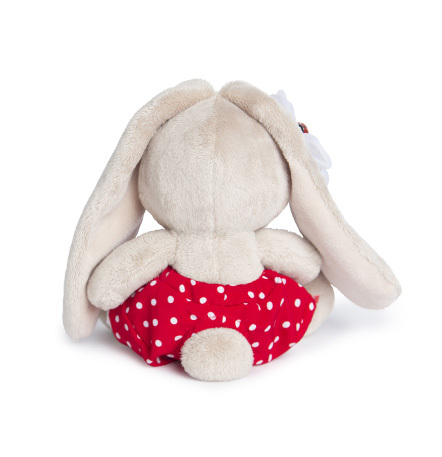 На Зайке забавные красные панталончики в белый горошек, украшенные белоснежным хлопковым кружевом. На ушке у Зайки — нежный белый цветок из органзы, в центре которого маленькая божья коровка.