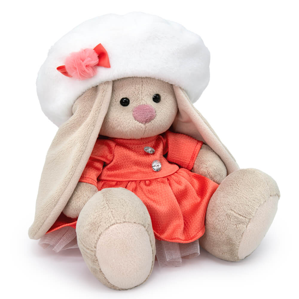 Зайка в красивом комплекте. Платье из плотного крепа кораллового цвета, сшито с длинным рукавом, отрезным по талии и с двумя пуговками кристаллами на грудке. Также в комплекте объемный, кипенно‑белый берет из короткого меха, украшенный бантиком с помпоном в тон платья.